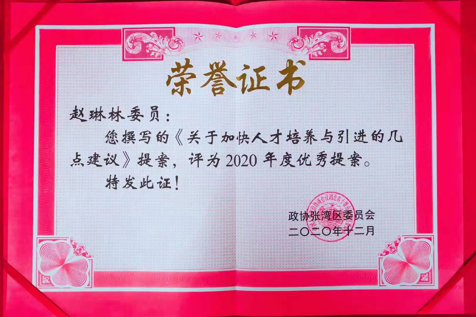 湖北震序車船科技股份有限公司黨支部書記兼副總經(jīng)理趙琳林同志的獲得了張灣區(qū)政協(xié)2019年度優(yōu)秀政協(xié)委員稱號,其《