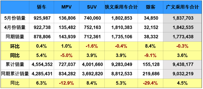 具體到車型方面,5月轎車同環(huán)比均實(shí)現(xiàn)增長(zhǎng),這也是車市增長(zhǎng)的主要推動(dòng)力;SUV依然處于同比增長(zhǎng)狀態(tài),但增速有所放緩;而MPV稍有起色,銷量環(huán)比實(shí)現(xiàn)增長(zhǎng),但同比沒(méi)能逃脫下滑的命運(yùn)。